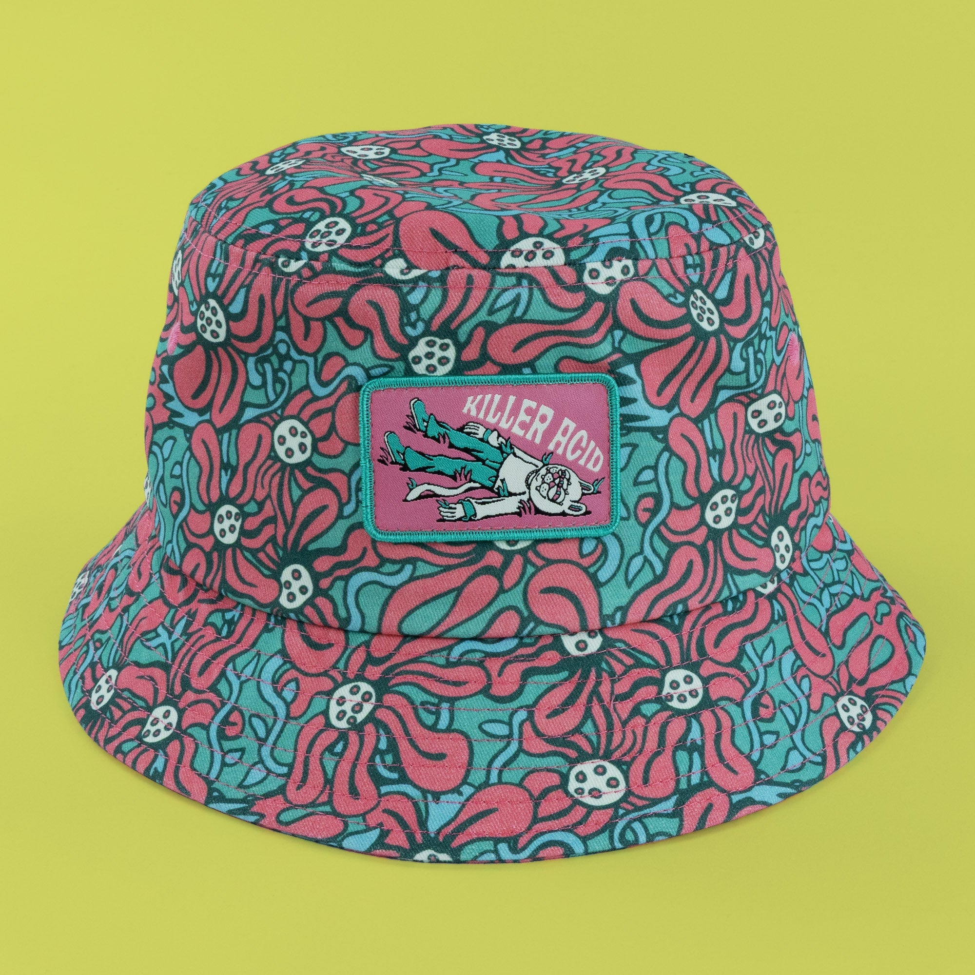 Psychedelic flowers in pink and turquoise cover every inch of this bucket hat. The swirling petals create a hypnotic pattern that's equal parts garden party and altered states. For those who like their florals with a side of chaos.