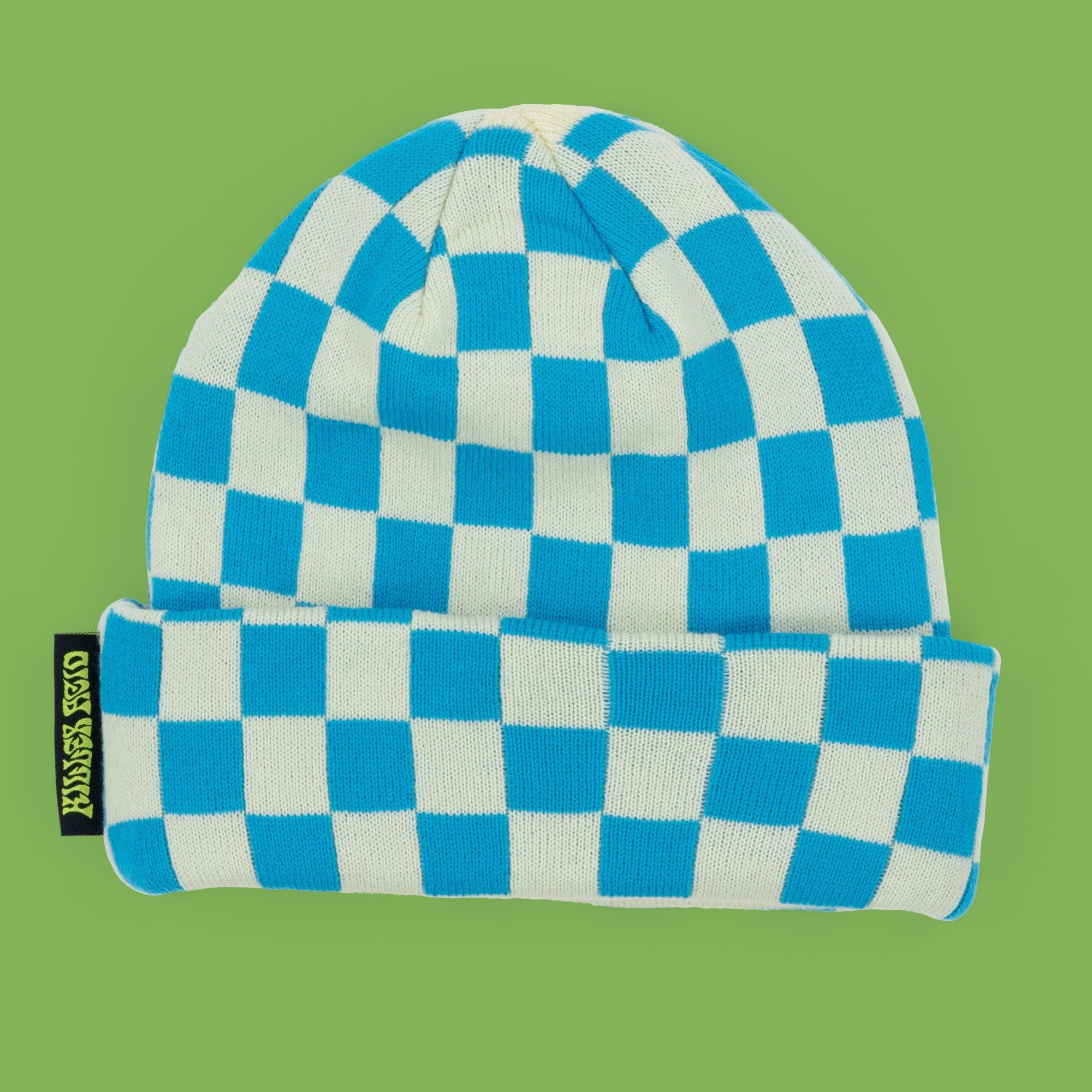 Blue and cream checkerboard pattern with an embroidered Wavy Cat graphic on the front. Classic beanie style that keeps your head warm without overthinking it. Perfect for those days when your hair is questionable but your style doesn't have to be.