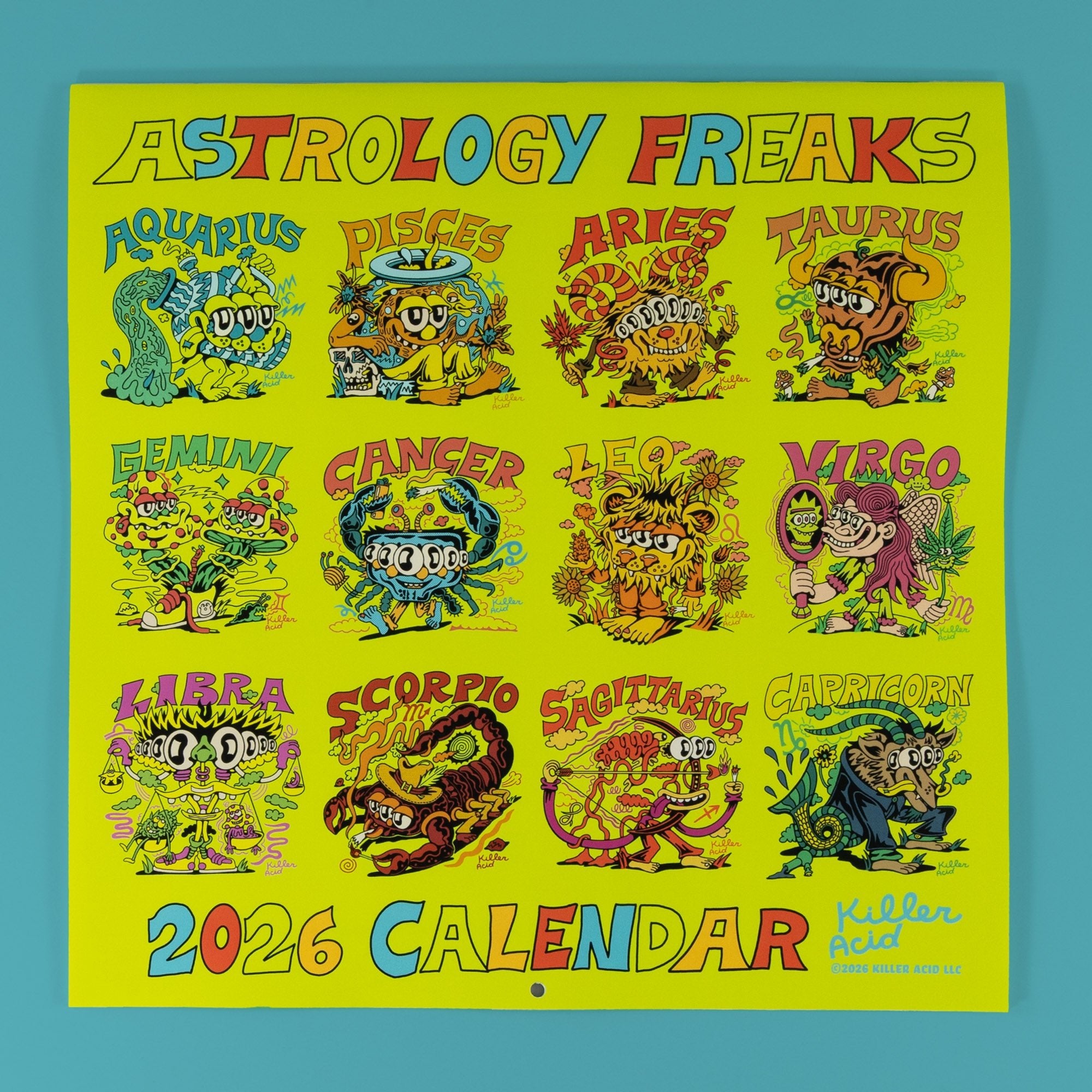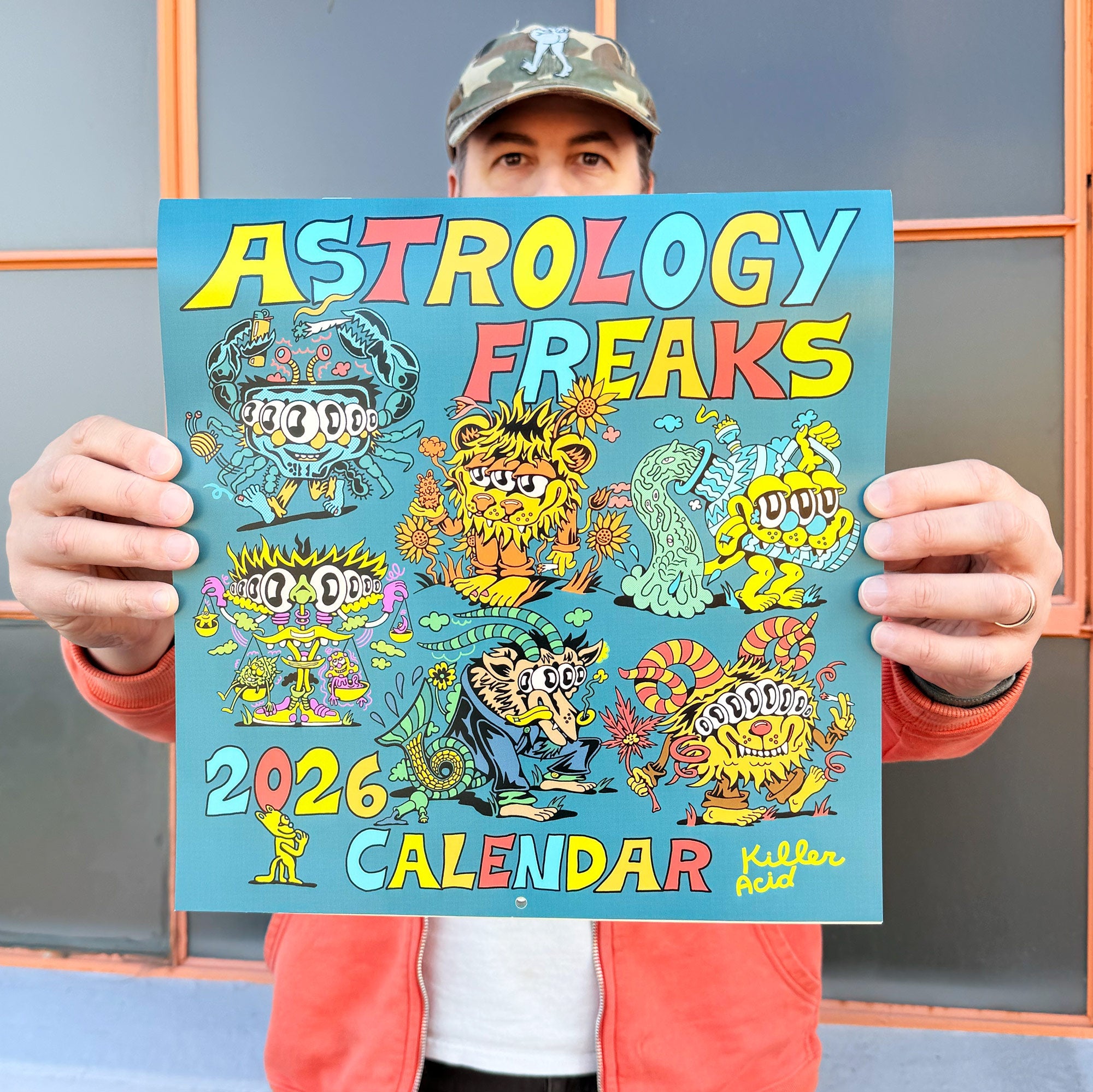 Twelve months, twelve freaky zodiac drawings. Our Astrology Freaks calendar features a full page illustration for each sign. Think less horoscope app, more psychedelic trip through the stars. Big enough to actually see the cosmic chaos (12x12") but printed closer to home in the USA. Find your month, plan your year, blame everything on Mercury Retrograde.