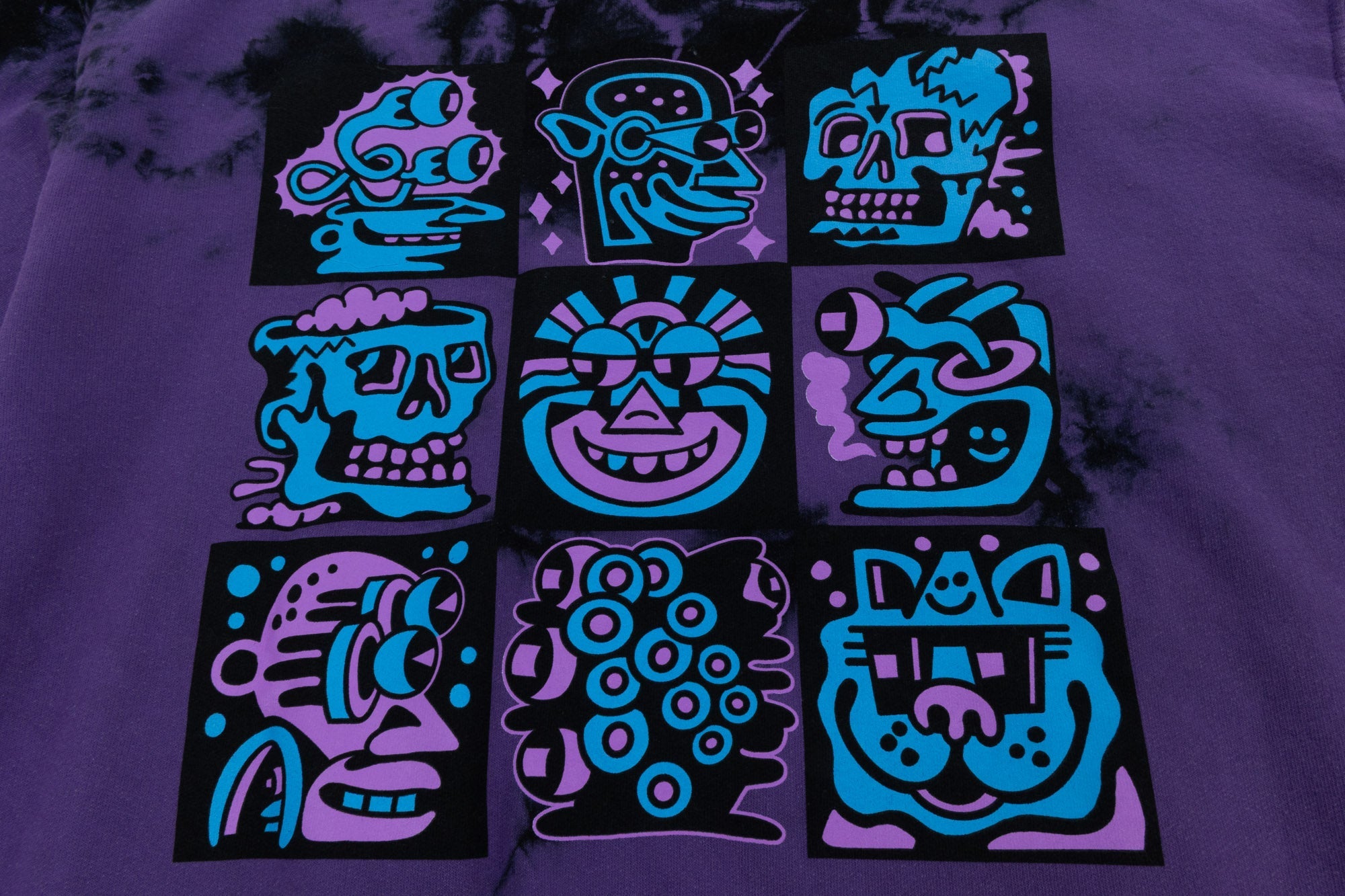 Nine freaky faces in a grid, each one weirder than the last. The Purple Heads design has quickly become one of our most iconic pieces. A collection of grinning, grimacing, and generally unhinged characters all stacked together. Because why have one face when you could have nine?