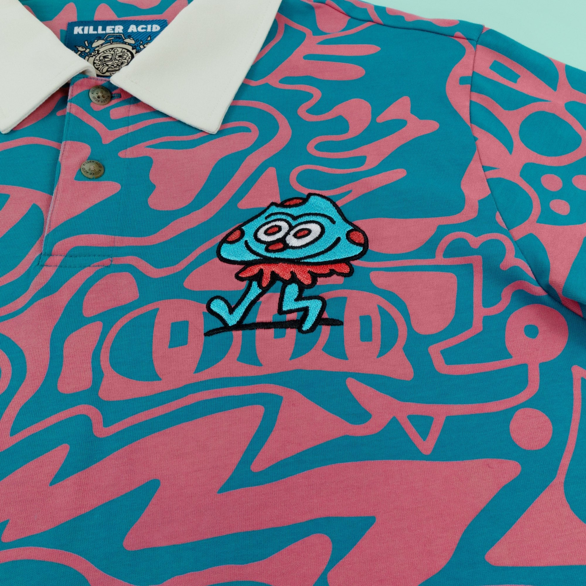 Blend right in on your next psychedelic journey with our Wild Shroom Rugby. Assimilate yourself into the swirling pink and blues. But please pay no mind to the screamer.