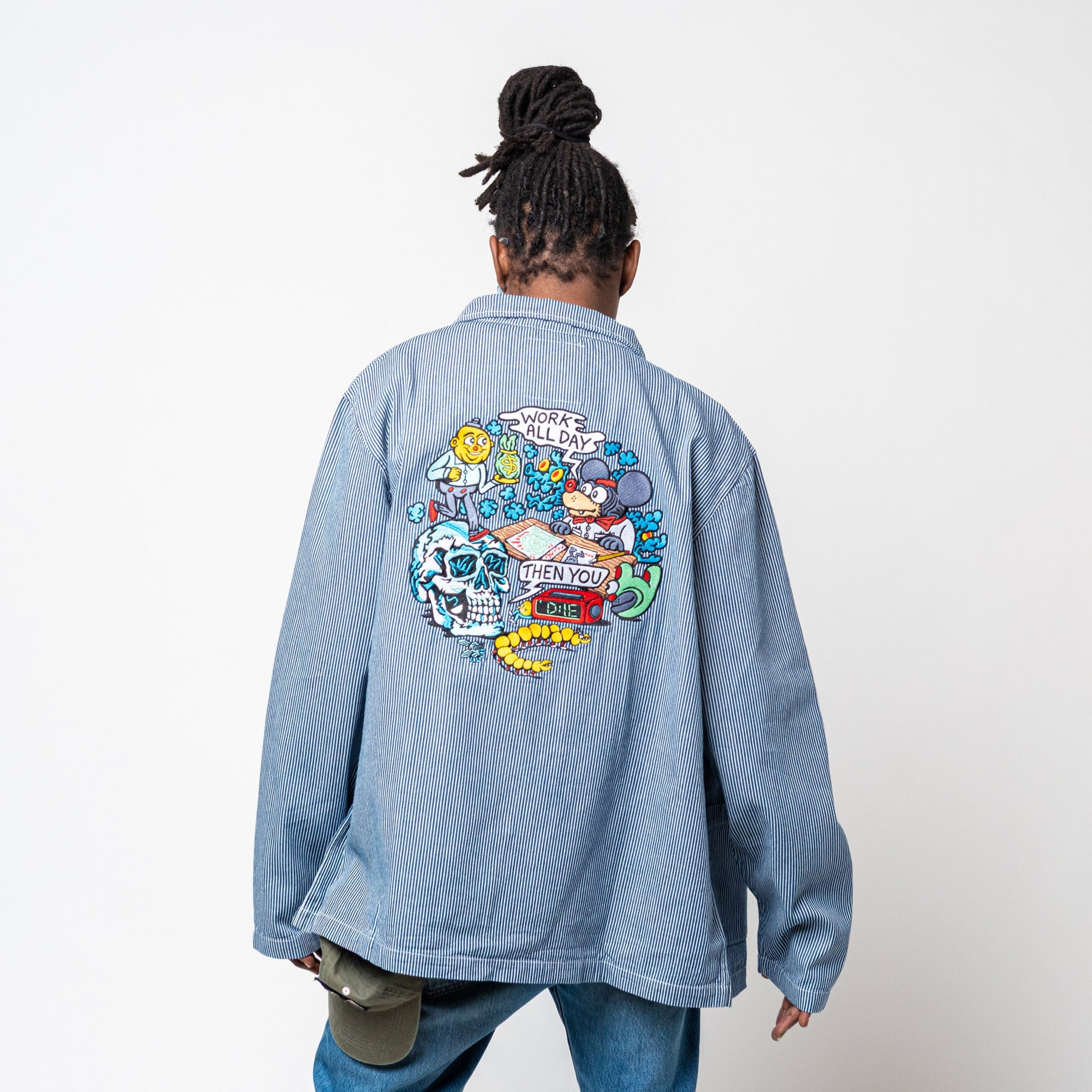 Whether you're shoveling coal into a steam engine or smashing a sleeve of Oreos into your face, this anti-work jacket is for you. Clock out forever, stick it to the man, roll up another, throw your timesheet in the trashcan. Our classic lightweight 100% cotton canvas anti-work wear jacket, now available in brown or blue and white railroad stripes.