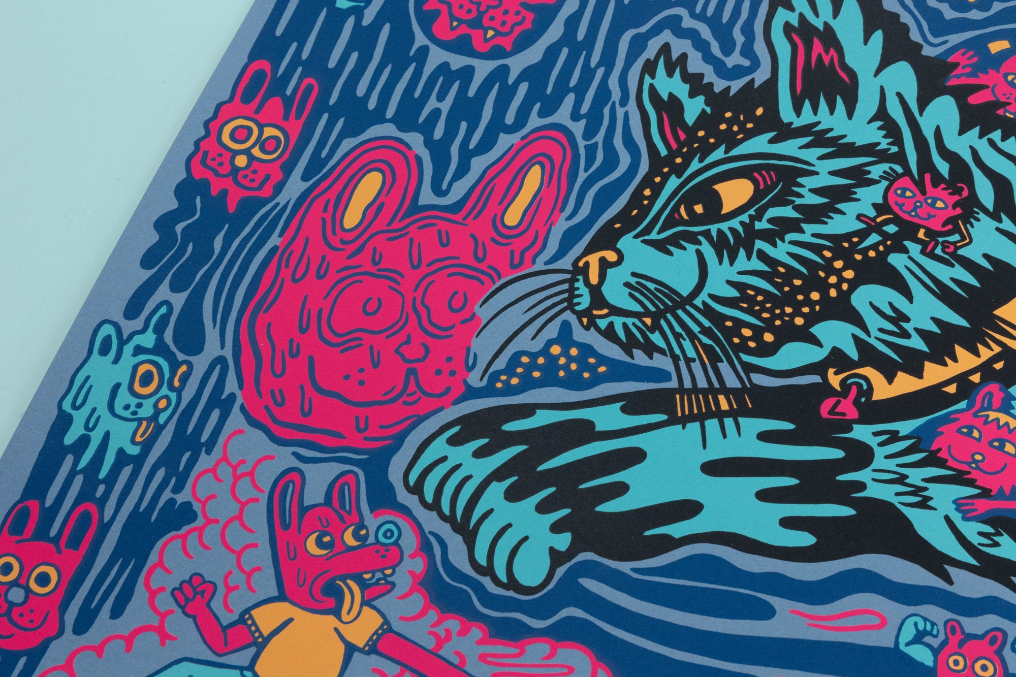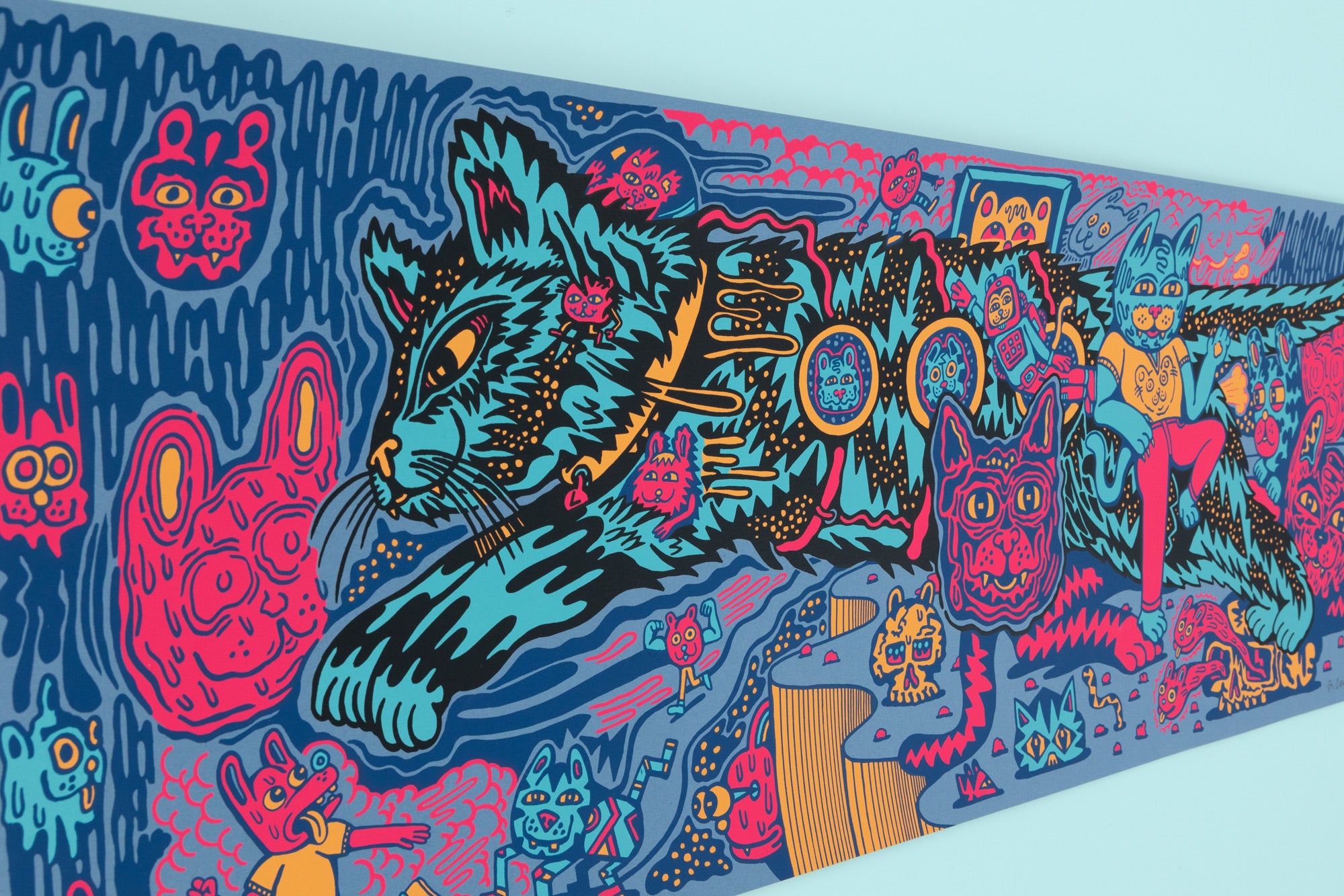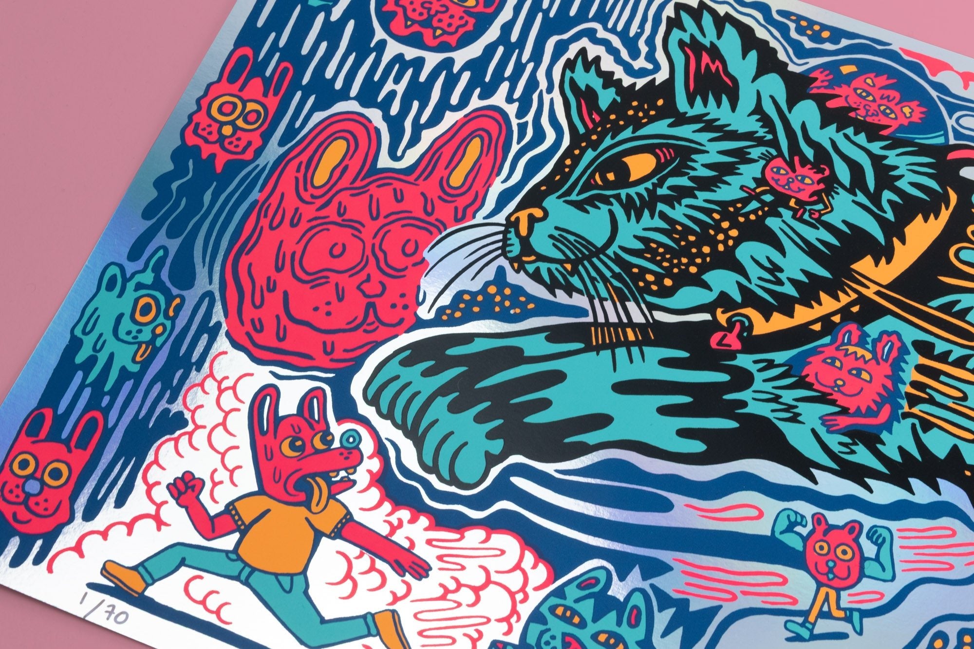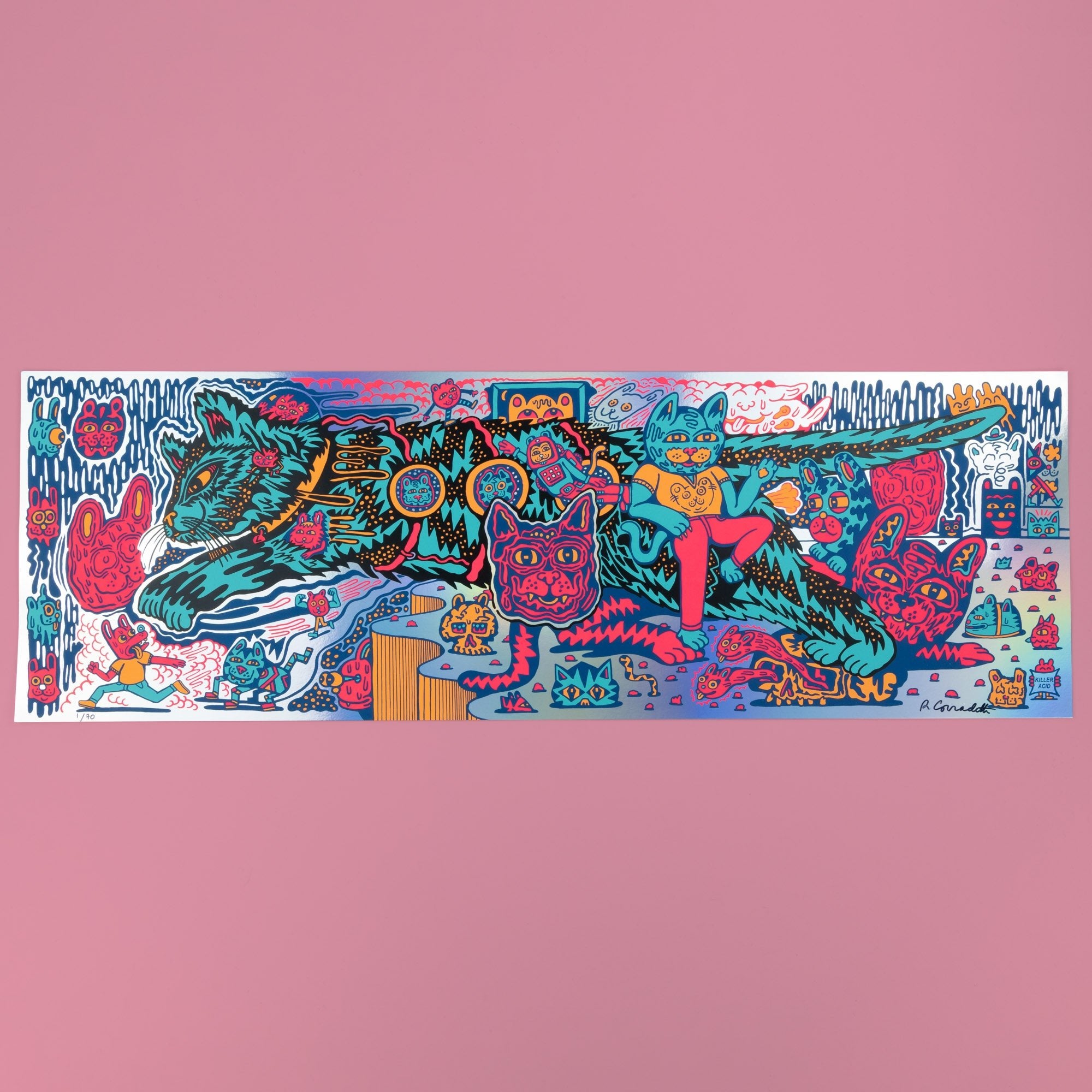 Cat Planet is a Killer Acid favorite! We have sold out of this print in yellow, orange, and red. Reissued on two new color ways, blue and rainbow foil.